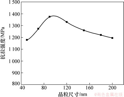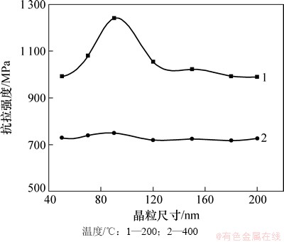 Fig. 8 Influence of nanocrystalline on UTS of electroformed Ni composites at middle temperature