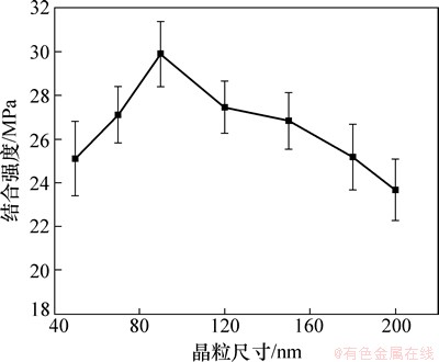 其中:σ0为常数;K为弹性系数;d为晶粒尺寸。可见理论上来说,随着晶粒的细化,基体强度应该始终增长的,再根据式(1),得出纤维增强复合电铸层强度随着晶粒的细化也应该始终增长,但这与实际测量结果不一致。原因在于纤维增强复合电铸层强度不仅仅与纤维以及金属的强度有关,还与两者的结合强度密切相关[14]。为此,本文根据单纤维拔出法[15-16],测定了硼纤维-纳米晶镍的结合强度,结果如图7所示。从图7可以看出:结合强度随着晶粒尺寸的变化并不是一成不变的。当晶粒尺寸大于90 nm时,结合强度随着晶粒的减小而提高。这是因为相比于微米晶,纳米晶使得沉积层孔隙率降低,致密度提升,镍离子在粗糙的硼纤维表面被还原成镍原子,并且不断累积,填满了硼纤维表面粗糙的凹坑并逐渐将纤维包裹住,形成界面,细化的晶粒使得此种结合更加紧密,将纤维紧紧地“箍”在其中。当硼纤维从镍基中被拔出时,界面致密度的提高明显提高了其被破坏的难度,在宏观上就表现出具有较高的结合强度。所以当晶粒尺寸处于这一区间时,随着结合强度与基体强度的双双提高,复合电铸层强度明显上升。当晶粒低于90 nm时,结合强度开始呈现十分明显的下降趋势。这是因为本实验是通过提高峰值电流密度来获取更细的纳米晶,但是随着峰值电流密度的提高,产生了大量的氢气吸附在硼纤维表面,使电铸层在纤维周围产生针孔,而纳米晶界面对缺陷的敏感度非常高,微小的缺陷将导致性能的显著下降。界面作为将载荷从基体传递和分散给纤维的媒介,必须要有较高的结合强度,否则界面一旦大面积被破坏、脱粘,将导致材料提前断裂失效[17],达不到根据式(1)计算出的强度。所以当晶粒细化至90 nm以下时,硼纤维-纳米晶镍复合电铸层强度开始下降。