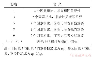 根据图1所示的各指标层次结构模型,采用1~9标度法(如表2所示)对各层中的因子相对上一层次目标的重要性进行两两相互比较,构造相应的判断矩阵。以基础指标坡体状况R1(边坡高度R11、坡度R12、土性R13、裂隙深度R14)的权重确定为例,构造相应判断矩阵R1,计算其最大特征值及对应的特征向量,然后进行判断矩阵一致性检验。当判断矩阵一致性指标 CR<0.1时,满足一致性要求,权重分配合理。