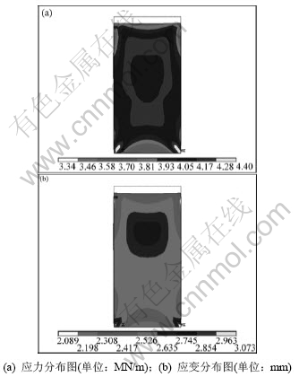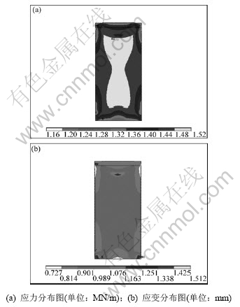 根据岩石材料在单轴压拉条件下的力学特性可知,在受力达到极限强度以前,随着应力的增大,应变也随之增大。在超过材料的极限强度后,岩体材料发生宏观破坏,由弹性转变到塑性阶段,此时,尽管所受应力逐渐减小,但应变仍呈增大趋势。图1所示为含层理面倾角为0°的模型在受均布线荷载时的应力和相应的应变分布情况,可从其中得出模型在单轴压缩条件下的临界屈服线荷载。倾角为0°时模型单轴抗拉分析图见图2。同理,可从图2中得出层理面倾角为0°时单轴拉伸的临界屈服线荷载。需要指出的是:利用数值模拟方法进行抗压试验时,采用的是直接在模型端部施加载荷的方法。而在实际试验中,直接拉伸试验较难实现,往往采用间接拉伸试验(如劈裂法等)来测定岩石的抗拉强度。