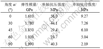 本次模型采用的参数由对糜棱岩取样(层理面与试件端面间的夹角分别为0°,58°和90°时)进行实验室测试所得参数提供[11]。根据试验中α为0°,58°和90°时的弹性模量参数,利用拉格朗日插值法分别得到α为0°,30°,45°,60°和90°时的弹性模量。
