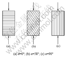 为了研究糜棱岩的力学特征,避免可能影响试件力学性能的其他因素的干扰,从块石样的采集到标准试件的制作都乾地仔细设计。共采集数块具有清晰的细观层理构造的糜棱岩,对每块岩石,按一定的α方向取样。α取值分别为0°,58°和90°(见图3)。将块石分别加工成直径为50 mm、高为100 mm的抗压试件和直径为50 mm、高为50 mm的抗拉试件,根据α取值不同分别制作3组抗压试件和3组抗拉试件。