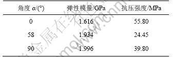 (1) 当α=0°时,单轴抗压强度出现最大值(56.0 MPa);当α为0°~60°时,抗压强度随α的增加而减小;在α为60°~90°时,抗压强度随α的增大而增大。当α=90°时的抗压强度为40.3 MPa。可见:抗压强度随α的增加,其变化趋势为先减小,后增大。