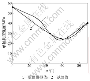 =30°~60°范围内有差异。分别由数值模拟曲线和试验结果曲线对抗压强度σc与