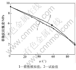 =30°~60°范围内抗压强度达到最低值。这一结果也符合莫尔-库仑强度理论关于破坏面方向的判据。由于试验中只取了3个角度,因此,数值模拟结果曲线与试验结果曲线在