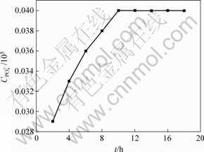 预备实验确定气?渣?金反应达到平衡的时间。取一实验渣样,按照既定的实验条件和操作步骤进行实验,分析不同反应时间下Ag中磷的质量分数,得到磷容量和反应时间的关系,如图1所示。由图1可见,渣?金反应进行10 h后渣中的磷容量随反应时间的延长不再发生变化,因此选取平衡时间为12 h。