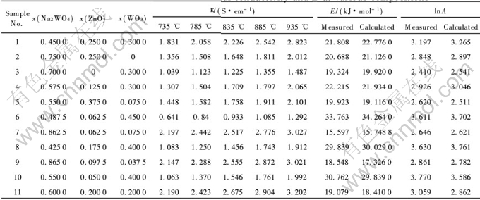 从图1可以看出, Na2WO4-ZnO-WO3 熔盐体系的11个不同组成的试样的电导率的自然对数与温度的倒数都成很好的线性关系, 其相关系数R都大于0.99。 从11组实验数据的线性回归所得方程提取的lnA以及电导活化能E的数值也列于表1。
