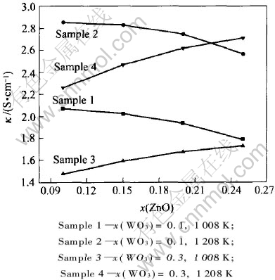 3) 当体系在Na2WO4含量一定的条件下, x(ZnO)与x(WO3)比值为1时的电导率最大。