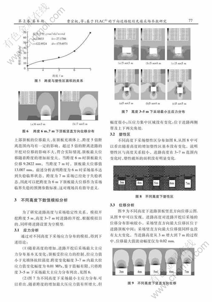 摘 要:采用下向进路胶结充填法的矿山,回采断面尺寸是关系矿山安全生产的重要参数结合工程实际,采用FLAC3D数值计算软件研究了矩形断面尺寸与采场稳定性的关系,对进路开挖后充填采场应力、位移、塑性区进行了分析结果表明:进路高度对采场稳定性影响不大,跨度为6m时采场处于失稳临界状态。
