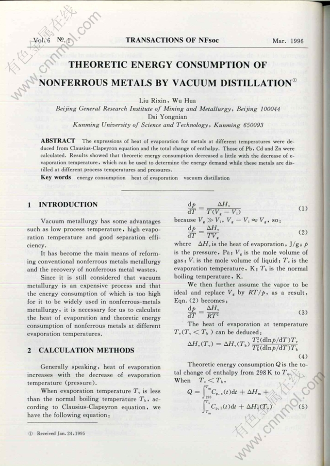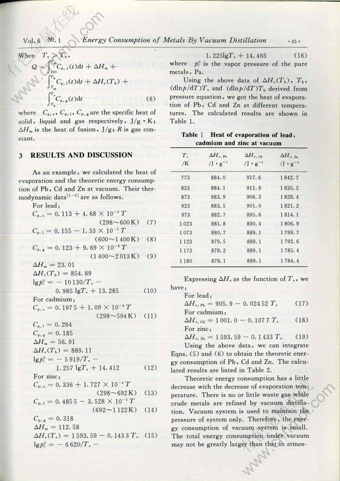 Abstract: The expressions of heat of evaporation for metals at different temperatures were de-duced from Clausius-Clapeyron eyuatian and the total change of enthalpy. Those of Pb, Cd and Zn were calculated. Results showed that theoretic energy consumption decreased a little with the decrease of e-vaporatian temperature, which can be used to determine the energy demand while these metals are dis-tilled at different process temperatures and pressures.
