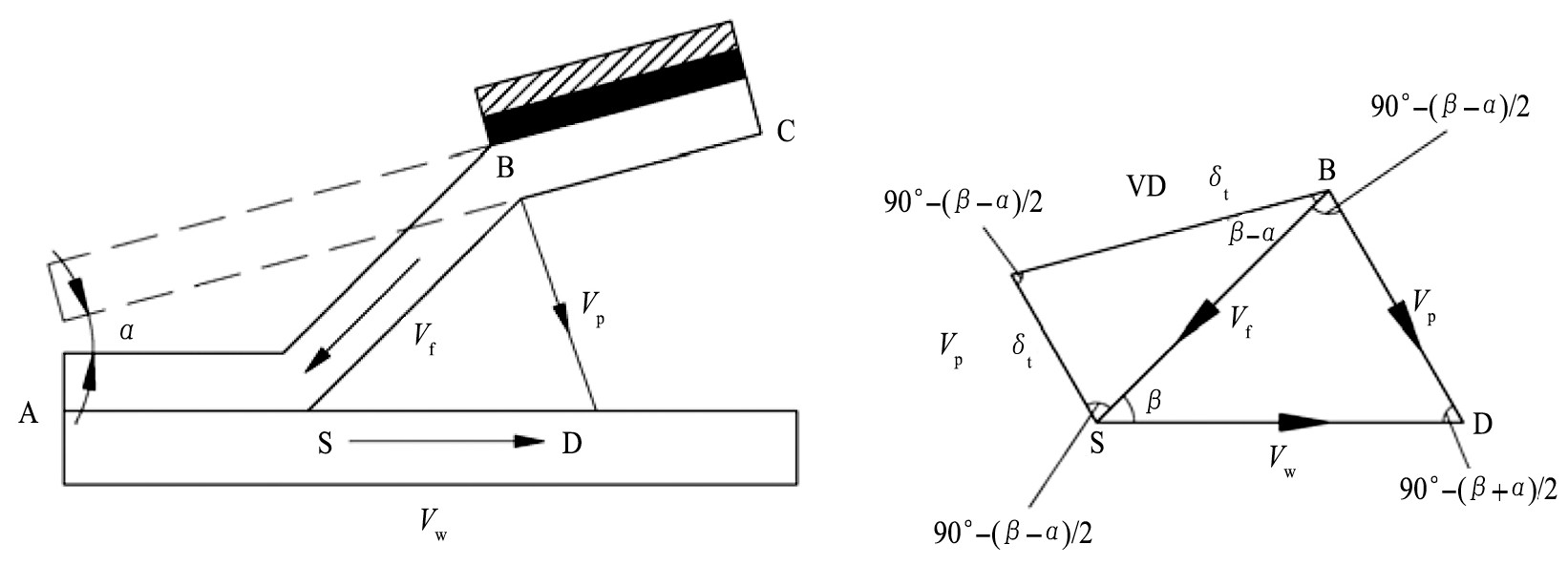 (4) 运动速度参数:爆炸后复板发生运动, 运动速度参数有:碰撞角β、复板碰撞速度Vp、碰撞点移动速度Vw、复板相对于碰撞点S的速度Vf、和动态弯折角θ。各参数间几何关系见图1[8]。