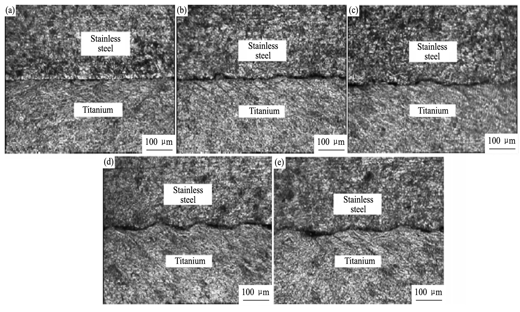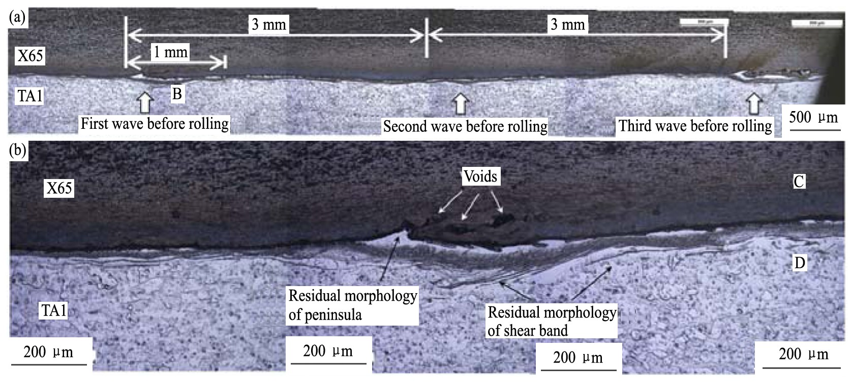 图6 纯钛-X65钢界面的光学图像Fig.6 Optical images of pure titanium-X65 steel interface[30] (a) Straight interface; (b) High-resolution image of position B