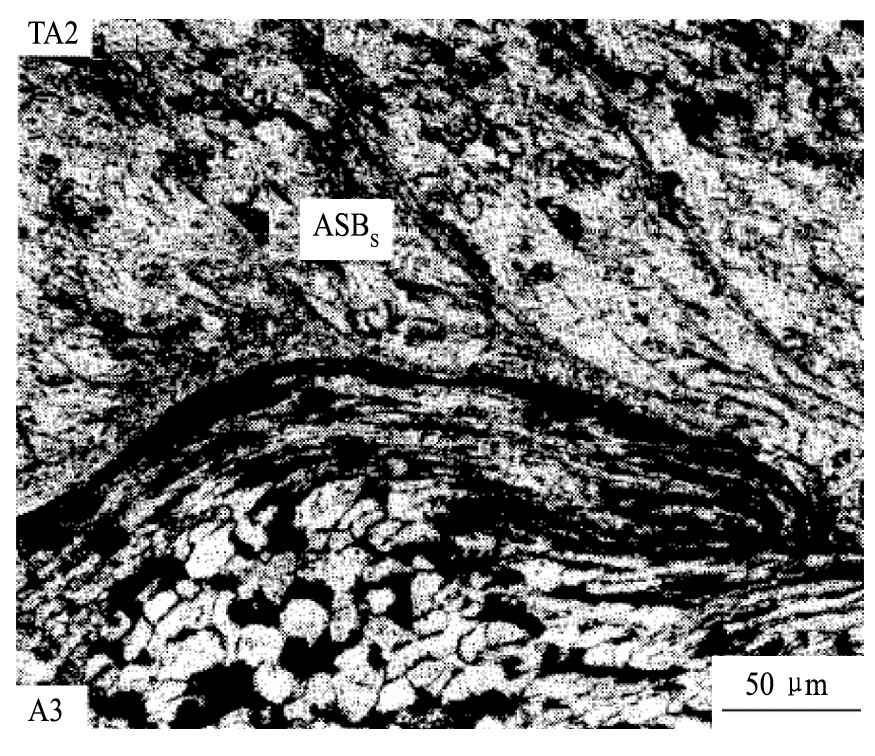 爆炸焊接制备复合材料界面存在缺陷。第一种常见的缺陷是存在于界面边界的褶皱和不复合区, 对复合界面力学性能产生影响。辛宝等[11]利用ANSYS软件对大面积钛-钢爆炸复合边界 (远离起爆点大约1.7 m以上距离) 褶皱和不复合现象进行了模拟研究, 发现原因是钛屈服强度高, 变形抗力大, 在碰撞时焊接点传递速度达到亚音速, 而钛的塑性变形跟不上。距离起爆距离越远, 变形累积越多, 一定程度后出现塑性畸变。Zhang等[12]利用LS-DYNA模拟了大面积钛板与钢板的爆炸焊接, 发现模拟结果与实验结果一致, 并阐述大面积爆炸焊接钛-钢的界面折叠缺陷及形成原因, 认为原因是钛延展性比钢好, 表现出更容易进行大的塑性变形的能力;雷管通常在板的中心点引爆, 由于尺寸大, 以起爆点为中心的不同方向, 导致同一截面内纵向塑性变形不均匀;大面积板的累积变形也是发生折叠缺陷的原因。第二种是绝热剪切带 (ASB) 。爆炸焊接过程中复板与基板高速撞击作用下, 界面发生剧烈剪切变形 (这个过程时间极短, 可以认为是一个绝热过程) , 变形区域呈带状, 称为绝热剪切带[13]。ASB是一种破坏形式, 其内部裂纹可导致材料失效[14,15]。Yang等发现了纯钛与A3低碳钢的爆炸复合中ASB只存在于钛侧, ASB显微结构如图3[16]所示。Wang和Yang[17]进行了商业纯钛与低碳钢的爆炸复合, 研究了复合界面中钛侧的绝热剪切带。研究表明在钛侧的波形上ASB的群体行为 (长度、数量、形状和间距等) 呈周期有序排布。随着位错密度的增加, ASB变长, 分布更密。目前消除这种绝热剪切带的方法是热处理。实验证明对TA2-A3复合材料进行退火, 其ASB可完全消除[18]。