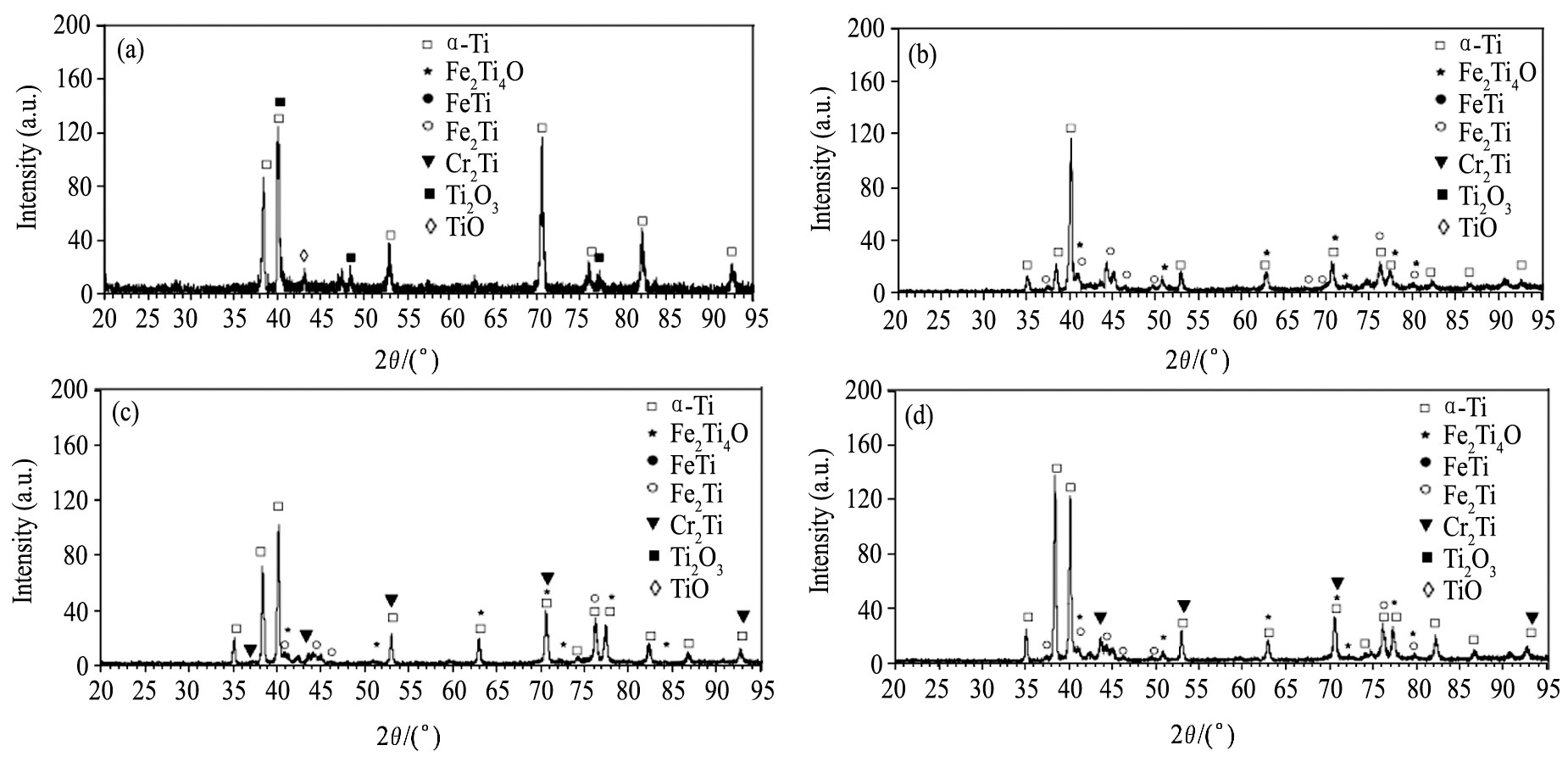 图4 不同爆炸载荷的复合材料断面钛侧的XRD分析Fig.4 XRD patterns for fractured surfaces of titanium sides for different explosive loads[8] (a) R=1; (b) R=1.2; (c) R=2.0; (d) R=2.5