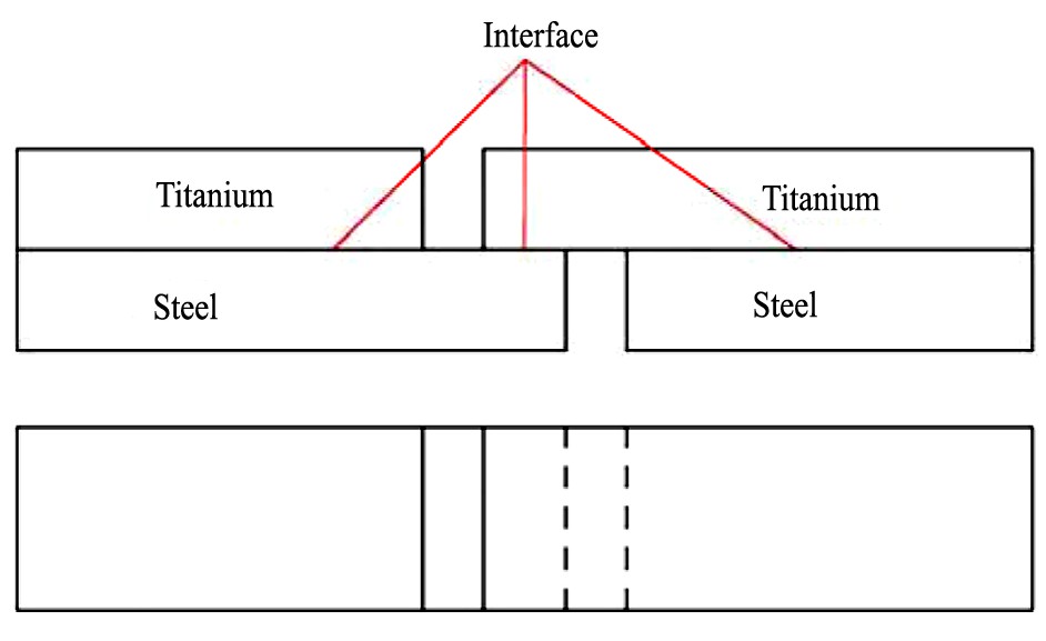 影响钛-钢界面力学性能的主要因素是焊接参数和界面脆性相的形成。利用中间层来减少Ti与Fe原子的扩散接触从而抑制脆性相的生成, 是目前解决这一问题的主要方法。当没有中间层, 文献中钛与低碳钢复合材料力学性能如表1所示, 测试性能的试样选取方法如图5[9]所示。可以看出爆炸载荷最大时极限抗拉强度和屈服强度最高, 而爆炸载荷最小时界面剪切强度最好。青铜-钽作为中间层, 使得钛-不锈钢爆炸复合界面最大抗拉强度达到1000 MPa[25]。