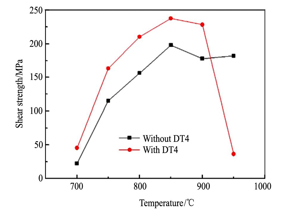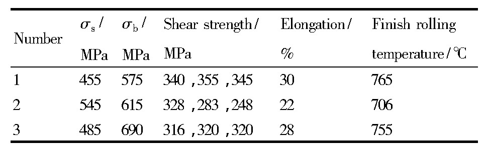 剪切强度和抗拉强度是衡量热轧钛-钢复合材料界面力学性能的主要参数。从其他相关学者的对于真空热轧复合材料力学性能的研究中可以看到:不使用中间层, 900℃真空轧制纯钛-HSLA钢界面最大剪切强度337 MPa[42];TA2-Q235B复合材料界面平均剪切强度为209 MPa[43]。