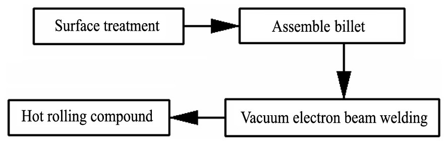 直接进行热轧而不进行金属表面状态处理, 界面氧化情况严重导致复合效果不好[38]。因此发展出了“组坯+真空焊接”的工艺, 即真空热轧复合。真空热轧复合过程图如图7[39], 将坯料表面清洁处理和平整处理, 叠好后放入真空室抽真空, 在真空环境下进行电子束焊接封住界面四周, 再进行热轧。真空电子束焊接保证了界面稳定的真空度, 界面几乎无氧化, 防止了热轧过程界面生成氧化皮。真空焊接后进行热轧将极大的保证界面复合质量, 形成优良的冶金结合。