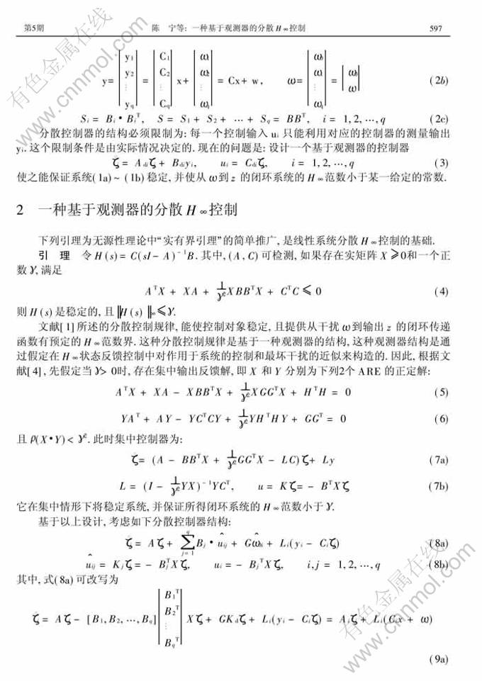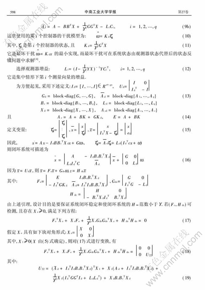 摘 要:提出一种基于代数Riccati方程设计分散控制律的方法.该法不仅计算简便,而且可获得较好的H∞性能指标.