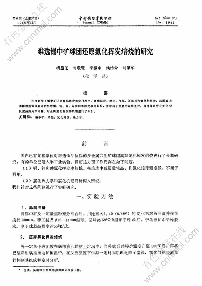 难选锡中矿球团还原氯化挥发焙烧的研究