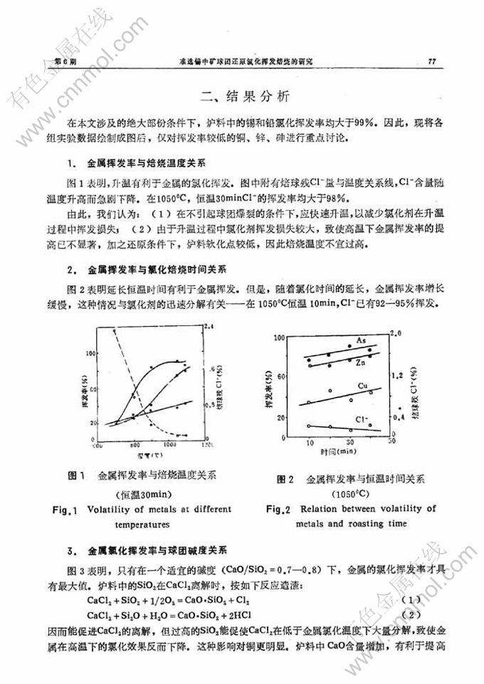 摘 要:本文研究了锡中矿还原氯化挥发焙烧过程中,氯化温度、时间、气氛、还原剂和氯化剂用量,球团碱度和添加剂等因素对炉料中锡、铅、铜、锌和砷等挥发率的影响,并给出了焙烧的最佳条件。通过体系中有关化学反应的热力学计算、对金属氯化挥发的机理进行了分析。