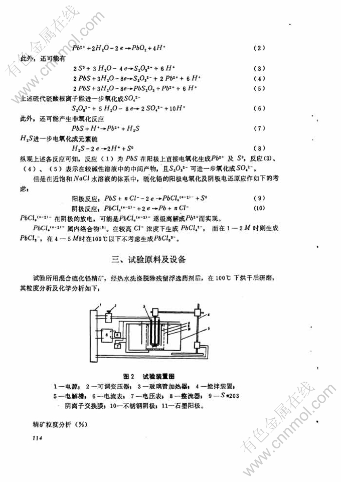 摘 要:本文介绍了一种无污染炼铅新方法,即硫化铅精矿在接近饱和 Nacl 的水溶液中进行矿浆直接电解,硫化铅在阳极上电氧化溶解,铅以 Pbcl2形式进入水溶液中,硫以元素硫形式残留于矿浆中随后回收,Pbcl2在阴极上电解沉积得金属铅。在适宜条件下,有关金属的阳极溶解率为,Pb>96%,Ag 90%。一般可得到二级以上金属铅。电能消耗约为800度/吨·铅。