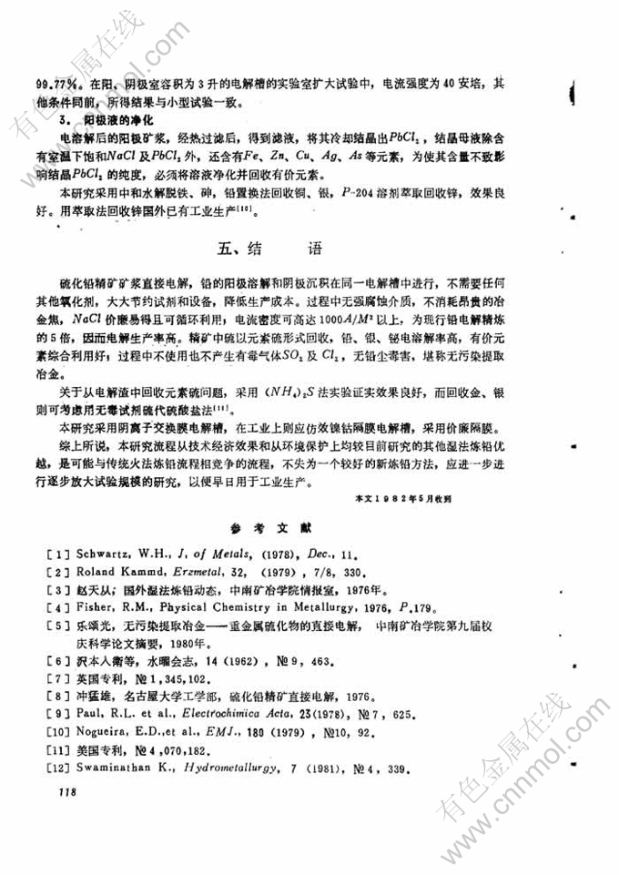 关键词:直接电解; 无污染; 铅精矿; 提取冶金; 金属硫化物; 水溶液; 元素硫; 矿浆; 适宜条件; 金属铅
