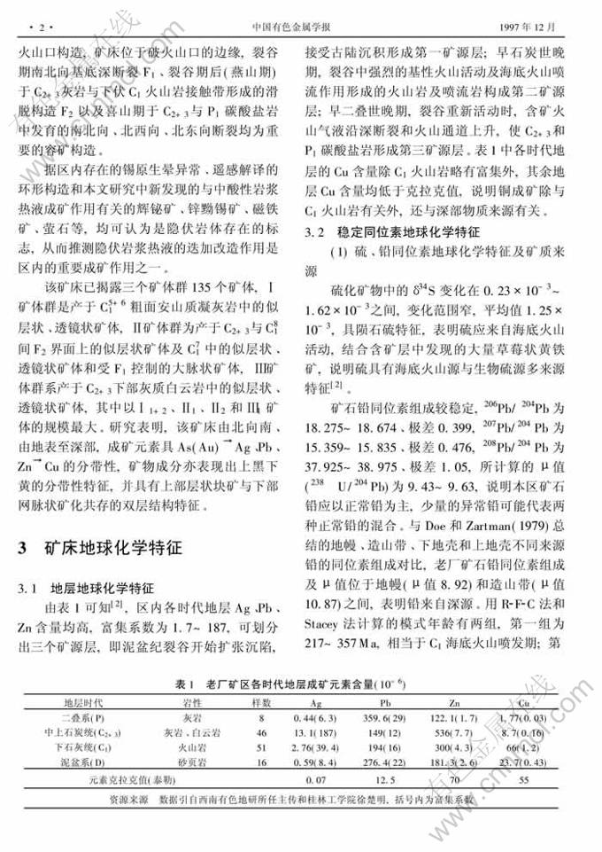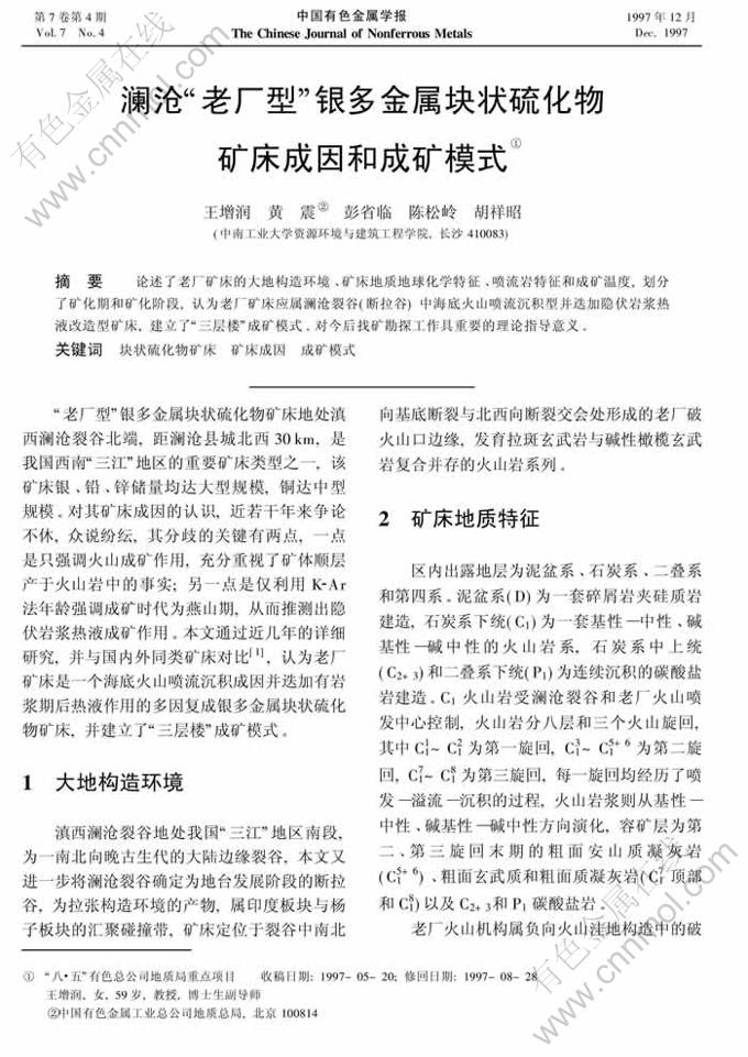摘 要:论述了老厂矿床的大地构造环境、 矿床地质地球化学特征、喷流岩特征和成矿温度,划分了矿化期和矿化阶段,认为老厂矿床应属澜沧裂谷(断拉谷)中海底火山喷流沉积型并迭加隐伏岩浆热液改造型矿床,建立了“三层楼” 成矿模式。对今后找矿勘探工作具重要的理论指导意义。