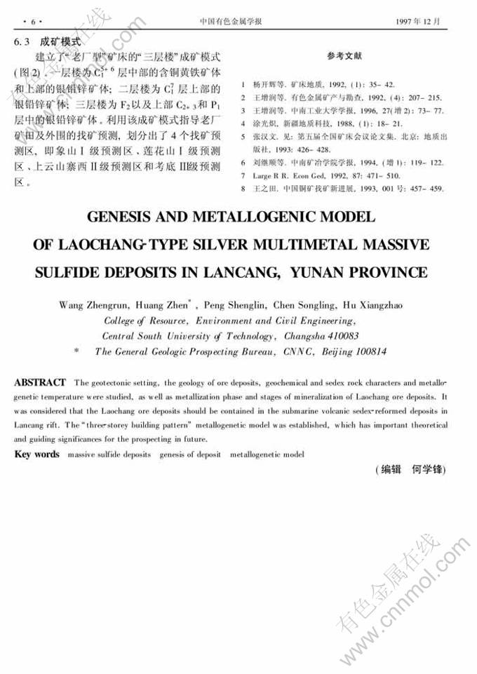 Abstract: The geotectonic setting, the geology of ore deposits, geochemical and sedex rock characters and metallogenetic temperature were studied, as well as metallization phase and stages of mineralization of Laochang ore deposits. It was considered that the Laochang ore deposits should be contained in the submarine volcanic sedex-reformed deposits in Lancang rift. The "three-storey building pattern" metallogenetic model was established, which has important theoretical and guiding significances for the prospecting in future.
