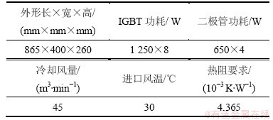 冷却过程为强迫风冷,可忽略辐射影响。在风道中,壁面处取无滑移边界条件,边壁的流动采用壁函数法;散热器安装在机柜中,基板上IGBT的功耗为恒定值,相当于恒定的热流密度,为第二类边界条件;机柜不向外传递热量,可近似处理为绝热边界条件;入口给定风速和环境温度,为第一类边界条件;机柜尾部风机采用抽风的方式,给定环境温度和环境压力,为第一类边界条件。