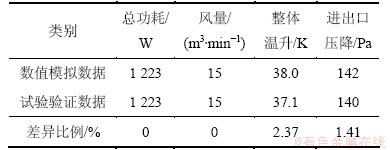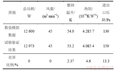2) 在风洞系统中进行试验研究,在功耗为12 973 W、风量为45 m3/min的工况下,散热器实测热阻为4.085 4×10-3 K/W,压降为150 Pa,满足热性能的设计要求。