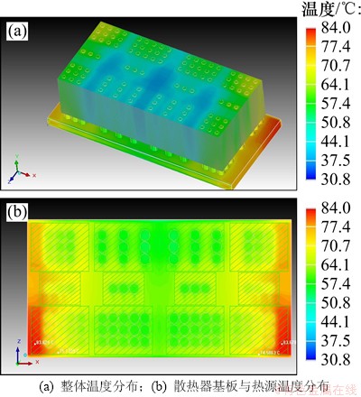 图5所示为CI用热管散热器温度云图。从图5可以看出:冷却风从+Z方向进入,从-Z方向流出。由于热管区域空气与热管换热,其换热系数是基板导热系数的数十倍,因此热管区域温度明显低于基板温度;在IGBT和二极管发热时,散热器上温度分布不均,其最低温度出现在进风侧的中间IGBT模块下面,最高位置出现在出风侧的两边。在温度最高区域,IGBT模块以下热管并非均匀布置,且对应的散热区域不足;如果热管散热器的翅片在X方向能增加20 mm,散热器的温升可降低3~5 K,但是由于CI机柜的结构限制,在现有尺寸能满足技术要求的情况下,暂不予调整。