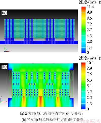 图6所示为CI热管散热器切面的速度分布。CI用热管散热器采用的是抽风方式,从Z方向的风速分布可以看出:散热器翅片间的风速比较均匀,且无涡流现象;在Y方向上,由于各模块下的热管分布不同,风速分布不均,IGBT下的单组热管之间风速相对较低,而两组热管之间的空隙部位则风速相对较快。理论上来说,出风侧的热管间如果风速较大,散热效果会更佳;但由于温度的分布不同,为保证出风侧IGBT的散热,需要足够多的热管数目来导热,因此风压增大而风速降低;从流动状况来看,后续改进可以考虑调整IGBT模块区域的热管布置,通过错开排列而形成紊流并将冷却风引导至高温区,从而优化散热性能。