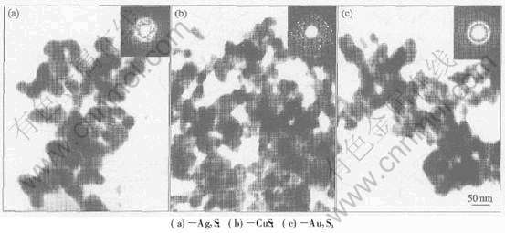 X射线粉末衍射和电子衍射结果表明, Ag2S、 CuS和Au2S3这3种纳米晶均有较好的结晶度和较高的纯度, 分别为单斜多晶结构、 六方多晶结构和立方多晶结构。 产物的衍射峰出现了不同程度的宽化, 说明产物的平均粒径较小。 利用Debye-Scherrer公式对产物尺寸进行估算, Ag2S的粒径约为29nm, CuS的粒径约为23nm, 与TEM的观察结果基本相符。