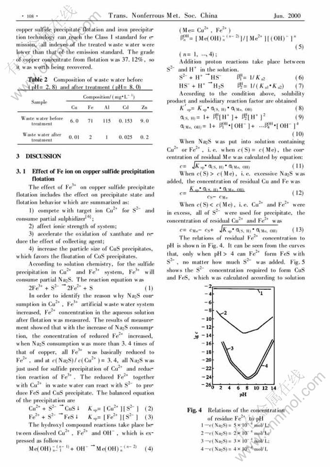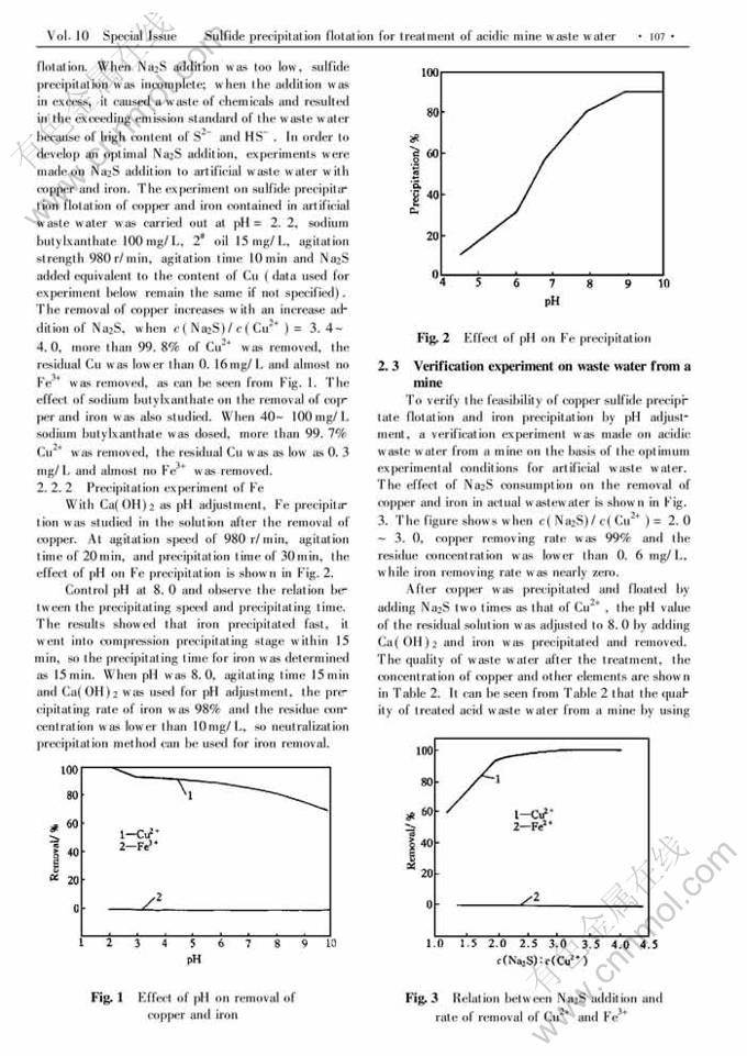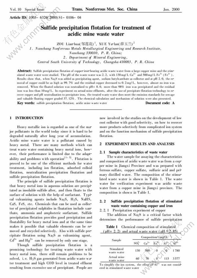 Key words:sulfide precipitation flotation; acidic mine waste water