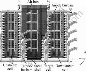 磁场边界条件如下:铝电解槽磁场求解属于开域问题,假设有限空气的外表面处于无限远处,在边界?Ω0的节点上施加零磁标量位,即Dirichlet边界条件。由于磁场强度沿铁磁区Ω1任何一闭合回路的线积分不为零,为多连通区域,应采用GP ψ-DP标量磁位法求解。本文作者建立的电磁场计算模型见图2,直角坐标系x轴向上与槽长轴方向平行,y轴指向阳极立柱进电侧,z轴垂直于纸面向外。为了兼顾计算资源与效率,研究磁场、流场所关心的求解区域如电解质、熔体与空气的网格密度都可以程序调节,最终计算网格选取为当疏、密2种不同网格所得解差别较小时的疏网格。