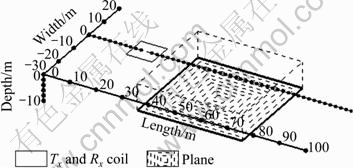 设发送矩形回线天线规格为10 m×10 m 40匝,接收矩形回线天线规格为5 m×10 m 40匝(通过调整天线放置方式达到测量3个方向分量的目的,其中x分量与测线方向平行,y分量与测线方向垂直,z方向与测线方向垂直且垂直于地面),分别在发送天线前方设置低阻板状体(规格为40 m×40 m×0.5 m,距离地面10 m,与地面倾角分别为0°、45°、90°和 135°),测线以2 m为间距设置51个点(测线设置如图1所示)[13-14],再设均匀半空间电阻率为1 000 Ω·m,并用EMIT公司的Maxwell软件进行数值模拟[15],测量其响应特征,绘制其响应曲线。