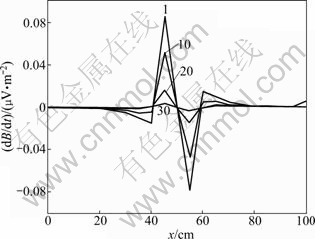实验采用的仪器是白云仪器公司生产的瞬变电磁仪MSD-1,采用矩形回线装置,其中发送回线规格为10 cm×10 cm 40匝,接收回线规格为5 cm×10 cm 40匝,发送电源为12 V,频率为25 Hz,叠加50次,采用40个时窗进行采样,并在发送天线前方设置低阻板状体(规格为40 cm×40 cm×0.5 cm,与发送回线夹角分别为0°和90°),测线以5 cm为间距布置21个点,进行两组实验,通过调整接收天线放置方式达到测量三分量的目的,实验结果如下(为第1、10、20、30道响应曲线,其中曲线上的数字表示采样时间道)。