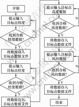 机载软件包括安装在归航控制器上的落点预置软件和归航控制软件。归航控制软件主要完成以下功能:(1) 接收并下传翼伞运动状态数据;(2) 根据归航控制算法计算出翼伞的关键参数和操纵量;(3) 接收手动无线控制指令;(4) 输出操纵执行装置驱动信号。迄今为止,已经发展的可控翼伞归航控制算法主要有3类[10-12]:简单归航、最优控制归航和分段归航。早期的翼伞系统主要采用的是简单归航方法:包括有盲角的径向归航控制方法、有盲角的比例径向归航控制方法、改型锥形归航控制方法、带盲区的非比例控制归航方法等。简单归航方法的不足在于:着陆精度极大程度依赖于初始投放点的位置,而且无法保证逆风着陆。需要另外设置逆风着陆控制来保证着陆安全。最优控制归航方法以对目标的终点距离偏差最小、所需控制能量最少等为目标函数,以给定的初始状态和终端状态为条件,寻求满足一定约束条件的最优控制量。最优控制归航求解比较困难,而且偏重于理论研究,目前没有得到实际应用。分段归航通常将整个归航轨迹分为若干段:每段所要实现的飞行目标不同。翼伞系统的气动力特性不易精确计算,需要一个鲁棒性比较强的归航控制方式,分段归航简化了翼伞整个飞行过程的控制流程,且由于翼伞着陆点通常是固定点,其基本运动形式主要是滑翔与转弯,便于分段设计。因此,归航控制软件选用了分段归航的控制算法:主要分为定向归航、盘旋削高、逆风控制、强制最终着陆4个阶段,其控制流程如图4所示。落点预置软件主要功能为将落点地理位置坐标和风向值等数据预先置入归航控制器,其流程如图5所示。