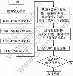 地面软件包括安装在地面控制计算机上的遥控通讯软件和GPS数据处理软件。遥控通讯软件主要功能为在手动操纵模式时,无线上传地面操作人员输入的手动归航指令并下载翼伞状态信息:包括经度、纬度、高度和航向角等,实现实时显示和存储。遥控通讯软件可以采用通用的RS232串口通讯软件。GPS数据处理软件的主要功能是将接收到的翼伞状态数据提取出来并转换为易于读写和处理的*.txt格式文件。其流程如图6所示。