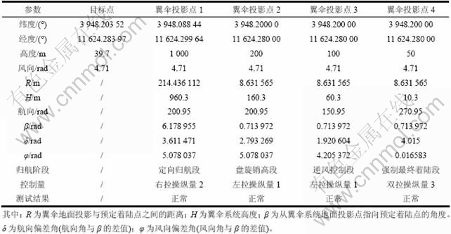 该精确定点归航翼伞控制系统研制完成后,对其进行软硬件桌面联合测试和带负载试验的验证。桌面联试分为自动归航和手动归航2种模式。自动归航模式测试选取了4个工作阶段16种工作模式的翼伞投影点作为输入。表1所示为在自动归航模式下的部分测试数据和结果。在手动归航模式测试中,地面控制计算机无线发送了7种手动归航控制指令:包括左拉操纵量1、右拉操纵量1、左拉操纵量2、右拉操纵量2、双拉操纵量3、无控(放松伞绳到初始状态)、退出手动模式。电机对7种手动遥控指令均响应迅速、到位精确。由此可见,控制系统对GPS数据的处理和运算、对电机操纵量的控制结果均非常理想,达到了设计预期的效果。