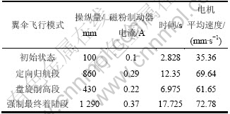 负载试验采用磁粉制动器作为操纵执行机构的负载。共完成了16个状态(包括4种操纵量、每种操纵量分别对应4种负载载荷)的操纵试验,其部分试验数据见表2。在负载试验中,最大载荷和低载荷情况下电机的运行时间均与设计值一致,电机到位和制动距离精确。试验还另外进行了电机自锁验证,即电机带载荷提升一段操纵量后静止约30 s后再提升另外一段操纵量,电机的自锁性能在试验中表现优异,与系统设计一致。因此,定点归航翼伞控制系统在上述2种地面大型试验中均工作正常、性能良好,达到了设计要求。