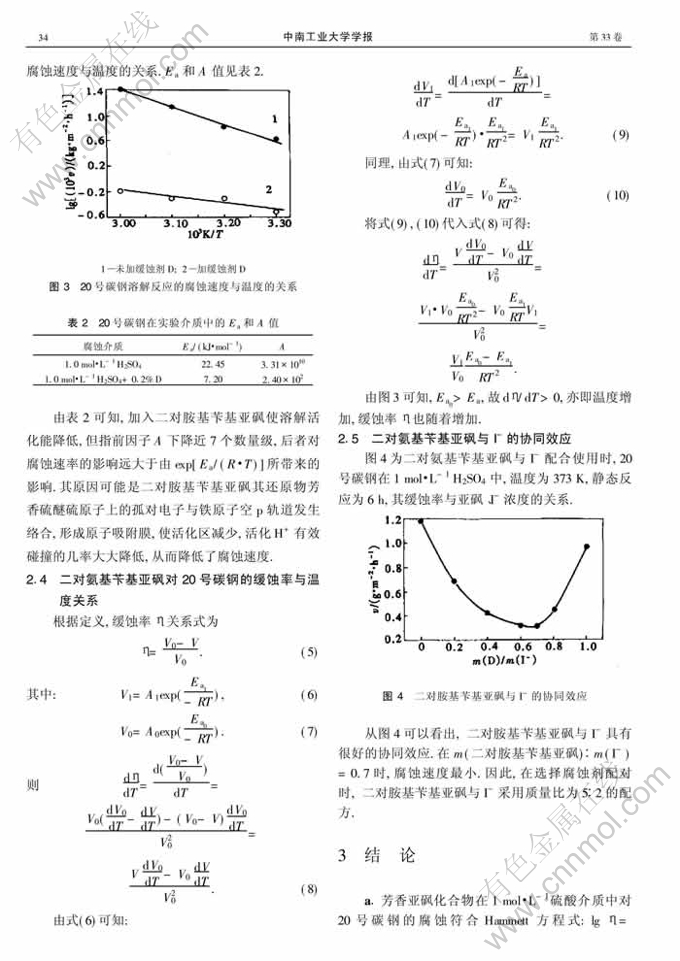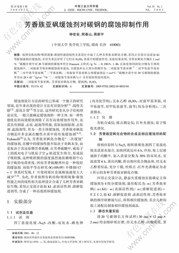 摘 要:按照有机结构-吸附现象-腐蚀性能的线性关系设计合成了几种芳香族亚砜化合物,采用正交设计法添加KI 等配制成相应缓蚀剂,并用失重法评价了它们在H2SO4体系中的缓蚀作用.实验结果表明,芳香亚砜化合物在1 mol ·L-1硫酸介质中对20号碳钢的腐蚀率符合Hammett方程式:lgη=-0.196σ+1.86.在浓度相同的化合物为主体的缓蚀剂中,二对胺基苄基亚砜缓蚀效率最高,且缓蚀率由大到小的顺序为:二对胺基苄基亚砜→二对甲氧基苄基亚砜→二对甲基苄基亚砜→二苄基亚砜;二对胺基苄基亚砜主体缓蚀剂在1 mol·L-1硫酸介质中对20号碳钢的腐蚀率为0.28×10-3kg·m-2·h-1,二对胺基苄基亚砜与I-具有较好的协同效应.