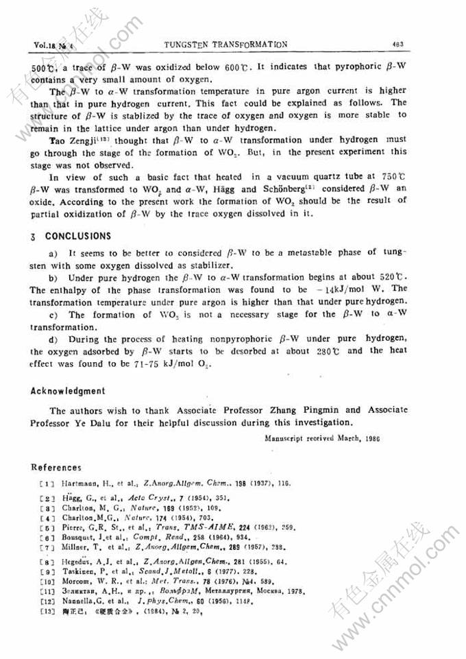 摘 要:本文以DSC法及对淬冷试样进行X射线分析的方法,研究了β-W在氢中和氩中向α-W的转变过程。非自然β-W在纯氢中升温时,约在280℃失去所吸附的氧,其解吸热为71—75kJ/mol O2。β-W至α-W的转变温度约为520℃,转变热为-14kJ/mol。这一转变过程并不一定要经由生成WO2的阶段。在纯氩中这一转变温度要比在纯氢中高。将β-W看作是由溶解氧所稳定的一种钨的亚稳相较为合适。