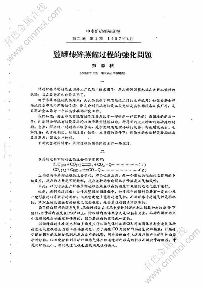关键词:沸腾焙烧炉; 竖罐炼锌; 蒸馏过程; 透气性; 团矿; 锌精矿; 生产能力; 工业性; 反应带; 正在进行