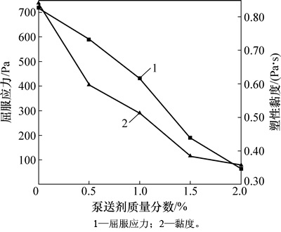 泵送剂对膏体絮团的破坏直接影响到流变性能,由图3可知:当添加剂质量分数从0增至2%时,膏体的屈服应力和塑性黏度明显降低。