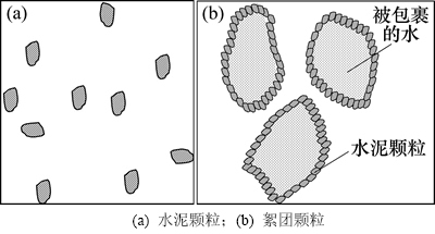 1) 加大了屈服应力。图5(a)所示为膏体中的水泥颗粒,处于分散状态,形成絮团结构后如图5(b)所示,膏体中的小颗粒组成了“絮团颗粒”,絮团的直径比单颗粒水泥直径大得多,使颗粒间的碰撞概率和接触面积变大,因此,增大了絮团之间的剪切作用力,导致膏体的屈服应力变大。