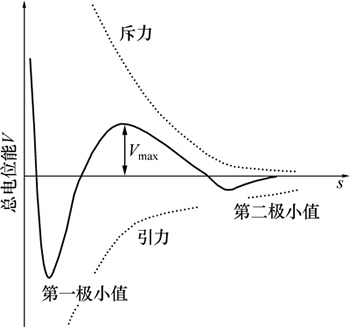 颗粒之间相互作用的总电位能V随颗粒间距离s变化的关系曲线如图8所示。当粒子间距较大或较小时,范德华引力占主导,粒子以相互吸引为主,在总的电位能曲线(图8)上表现为第一极小值和第二极小值。在中间状态时斥力作用更占优势,电位能曲线上有1个极大值Vmax,称作位能势垒。位能势垒表示水泥颗粒之间的合力为斥力,若颗粒的热运动无法克服位能势垒,则无法聚集,处于稳定的悬浮状态。
