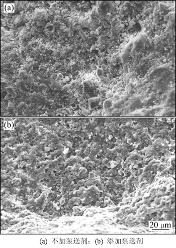由图9可以看出:泵送剂的分散作用明显,没有添加泵送剂的膏体凝结后表面较为致密,颗粒间隙很小;添加泵送剂的膏体更疏松,孔隙更多。从图9(a)可以看到:较大的絮团结构,可达到几十μm。相比之下,当泵送剂粒径质量分数为1.5%时,膏体内颗粒之间的分散度高,颗粒较小且更为均匀,基本为几μm,图9(b)中没有发现明显的絮团结构。