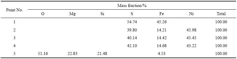 图2所示为精矿不同区域的背散射电子形貌像,由图2可知,该区域矿相组成复杂,主要存在灰黑色区域1,灰色区域2、3、4及黑色区域5。可以看出:矿物分布不均匀,不同矿相间相互嵌布,且粒度分布范围较宽。由元素面扫描分布图可直观地看出:镍的分布与硫的分布相似,说明镍主要以硫化物形式存在,主要集中分布在灰色区域部分;铁存在于硫化物及硅酸盐相中,分布不均匀,说明铁以硫化物和氧化态形式存在。