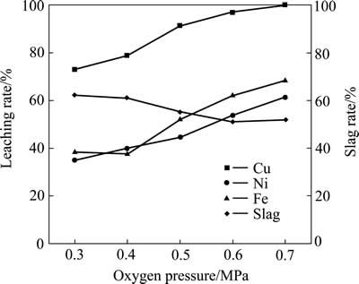 Fig. 7 Effect of oxygen pressure on Cu, Ni, Fe leaching rate and slag rate